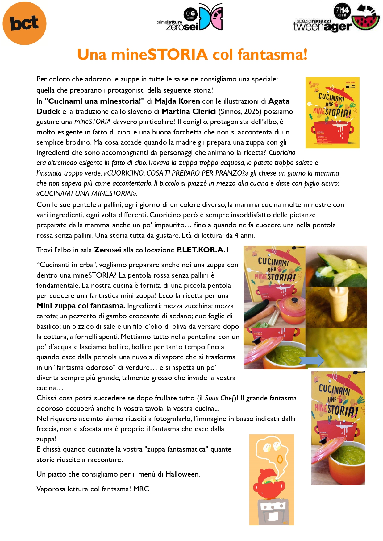 Halloween, il periodo più pauroso dell'anno sta avvicinandosi. Che ne dite di leggere una storia con un succulento fantasma? Per coloro che adorano le zuppe in tutte le salse ne consigliamo una speciale: quella che preparano i protagonisti della seguente storia! In "Cucinami una minestoria!" di Majda Koren con le illustrazioni di Agata Dudek e la traduzione dallo sloveno di Martina Clerici (Sinnos, 2025) possiamo gustare una mineSTORIA davvero particolare! Il coniglio, protagonista dell’albo, è molto esigente in fatto di cibo, è una buona forchetta che non si accontenta di un semplice brodino. Ma cosa accade quando la madre gli prepara una zuppa con gli ingredienti che sono accompagnanti da personaggi che animano la ricetta? Una storia gustosissima.