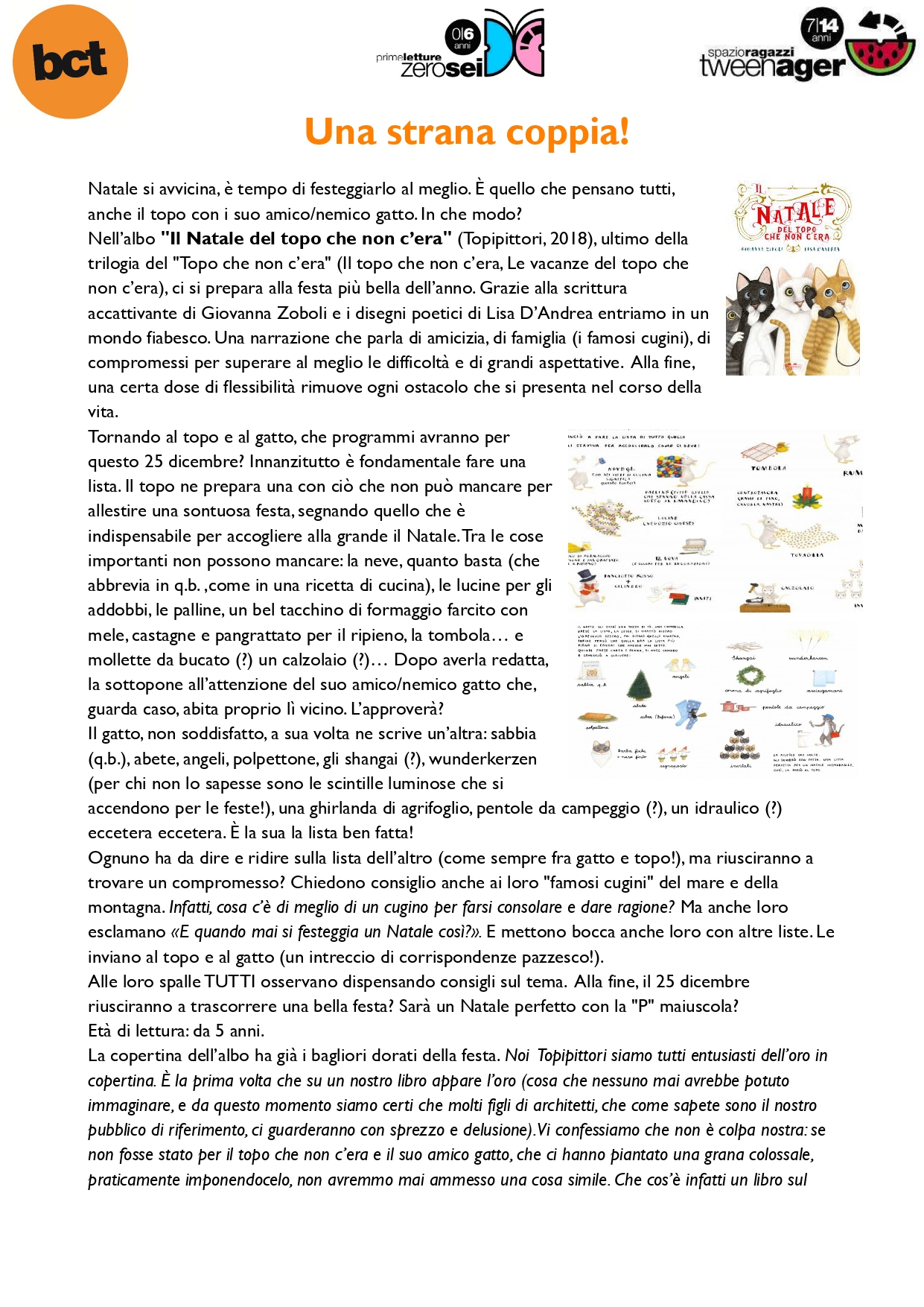 "Il Natale del topo che non c’era" (Topipittori, 2018), ultimo della trilogia del "Topo che non c’era" (Il topo che non c’era, Le vacanze del topo che non c’era), ci si prepara alla festa più bella dell’anno. Grazie alla scrittura accattivante di Giovanna Zoboli e i disegni poetici di Lisa D’Andrea entriamo in un mondo fiabesco. Una narrazione che parla di amicizia, di famiglia (i famosi cugini), di compromessi per superare al meglio le difficoltà e di grandi aspettative. Alla fine, una certa dose di flessibilità rimuove ogni ostacolo che si presenta nel corso della vita. Tornando al topo e al gatto, che programmi avranno per questo 25 dicembre? Innanzitutto è fondamentale fare una lista. Il topo ne prepara una con ciò che non può mancare per allestire una sontuosa festa, segnando quello che è indispensabile per accogliere alla grande il Natale. Tra le cose importanti non possono mancare: la neve, quanto basta (che abbrevia in q.b. ,come in una ricetta di cucina), le lucine per gli addobbi, le palline, un bel tacchino di formaggio farcito con mele, castagne e pangrattato per il ripieno, la tombola… e mollette da bucato (?) un calzolaio (?)… Dopo averla redatta, la sottopone all’attenzione del suo amico/nemico gatto che, guarda caso, abita proprio lì vicino. L’approverà? Il gatto, non soddisfatto, a sua volta ne scrive un’altra: sabbia (q.b.), abete, angeli, polpettone, gli shangai (?), wunderkerzen (per chi non lo sapesse sono le scintille luminose che si accendono per le feste!), una ghirlanda di agrifoglio, pentole da campeggio (?), un idraulico (?) eccetera eccetera. È la sua la lista ben fatta!