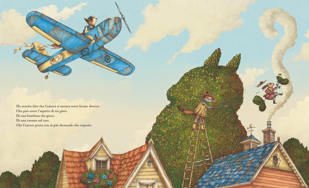 Luca Tortolini cerca di trovare una risposta, ma ogni volta qualcosa lo rende incomprensibile. L’amore è un’alchimia misteriosa? Certamente un gioco magico che si esplica in tante forme e in tanti modi. Chi è fortunato ce l’ha, altri lo desiderano, qualcuno l’ha perso, altri vivono senza. Sfogliando l’albo conosciamo un mondo popolato da animali che trascorrono insieme del tempo, forse la vita? Li incontriamo in spiaggia, c’è chi pesca; altri in una giornata nuvolosa si riparano dalla pioggia; c’è chi assiste ad un teatrino, forse di burattini; un piccolo gruppo chiacchiera, alcuni leggono. In ogni illustrazione è presente una costante, un postino con la borsa carica di buste. Talvolta sorvola tutta la costa con un aeroplano per consegnare le missive. Lettere particolari, alcune piene di ghirigori, altre semplici. Che cosa potrebbero contenere? Abbiamo qualche indizio? Guardiamo bene. Forse sono lettere d’amore? L’amore è una parola semplice. L’amore è più di una parola semplice. Buon San Valentino!