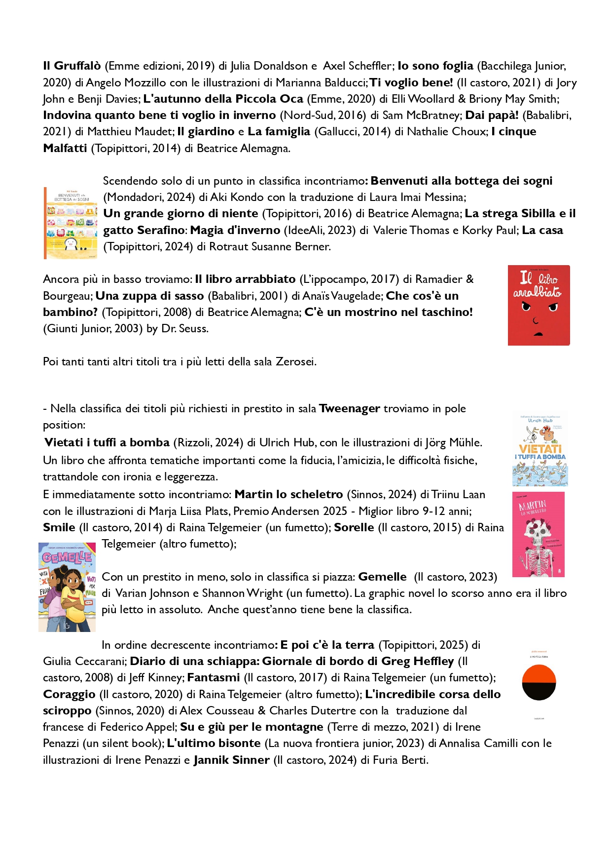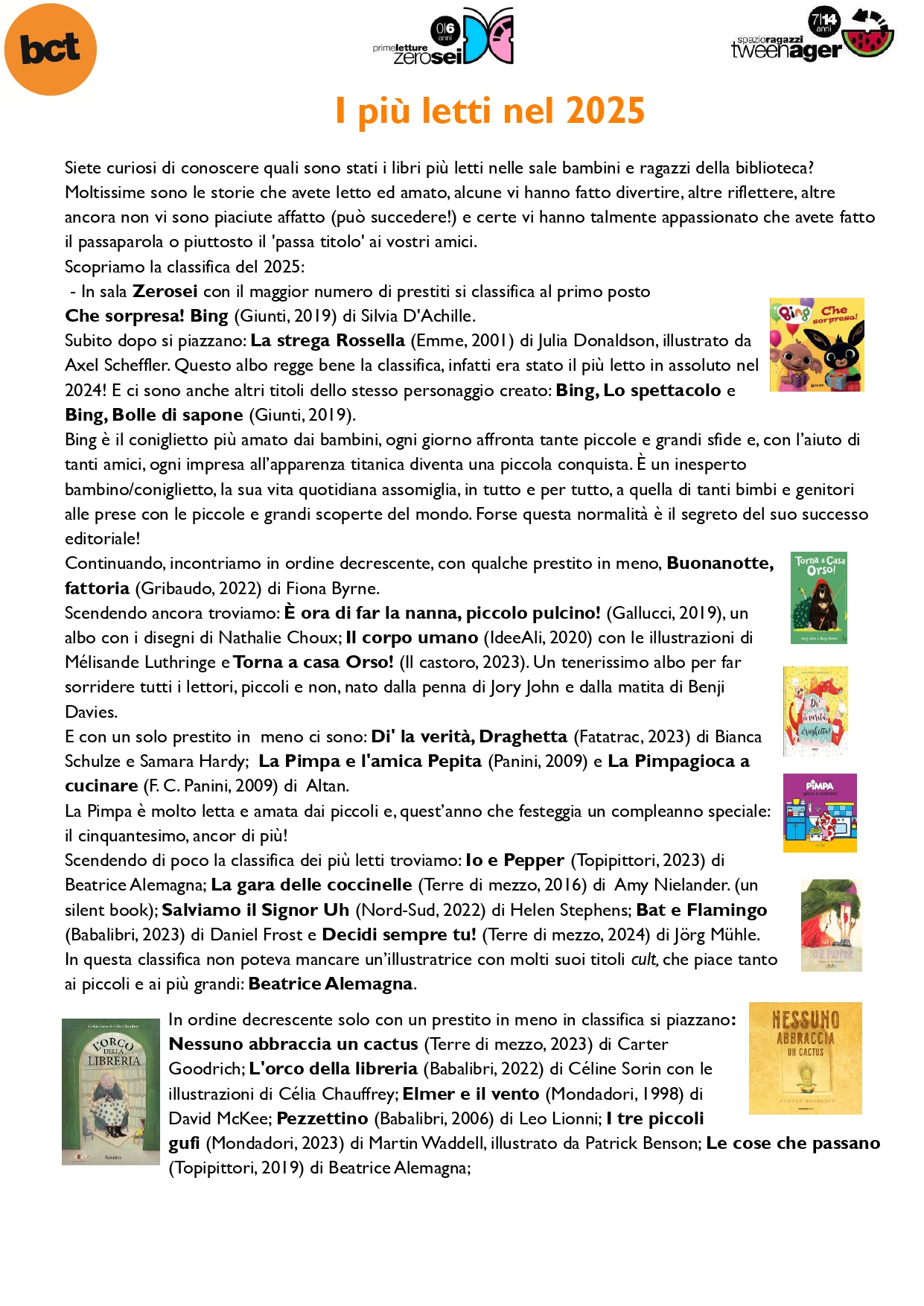 Questi sono alcuni titoli presenti ai primissimi posti nella hit parade delle sale di bctragazzi. Una cosa è certa, abbiamo una grande squadra di bambini e ragazzi che amano leggere. Ciò fa ben sperare per il futuro.