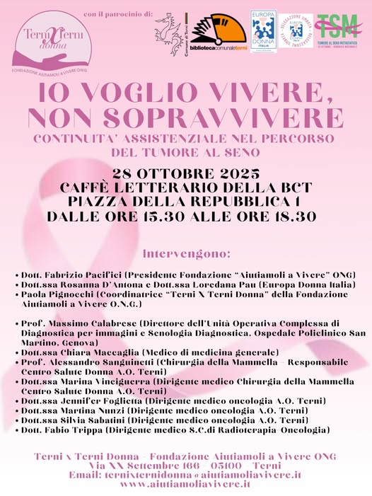 caffè letterarioMartedì 28 ottobre, caffè letterario ore 15:30, Io voglio vivere, non sopravvivere: continuità assistenziale nel percorso del tumore al seno, convegno promosso da Terni x Terni Donna.