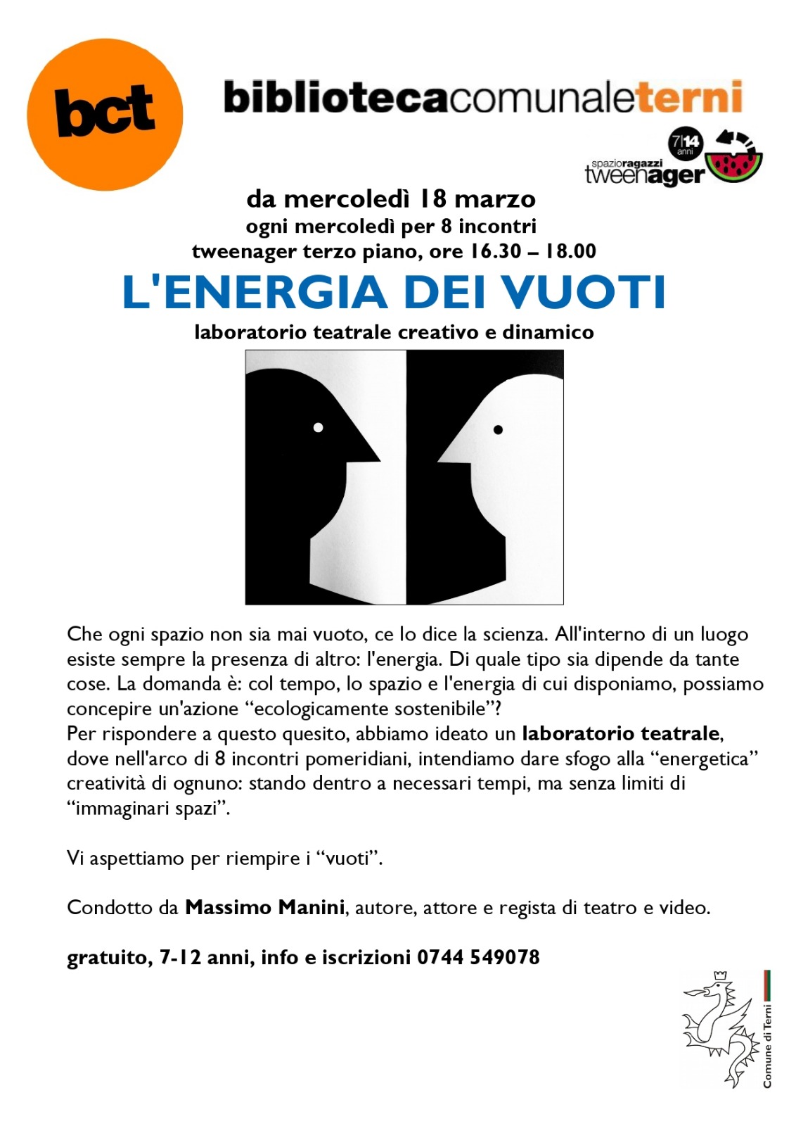 Che ogni spazio non sia mai vuoto, ce lo dice la scienza. All'interno di un luogo, apparentemente privo di materia visibile, esiste sempre la presenza di altro: l'energia. Il definire di quale tipo sia ogni dinamica o spinta, dipende invece da tante cose: dall'ambiente alla temperatura, ad altri infiniti fattori dipendenti o meno da nostra volontà. Spazio ed energia sono quindi concetti inseparabili legati dall'inossidabilità del tempo. E quindi la domanda è: col tempo, lo spazio e l'energia di cui disponiamo, possiamo concepire un'azione “ecologicamente sostenibile”? Per rispondere a questo quesito, abbiamo ideato un laboratorio teatrale, dove nell'arco di 8 incontri pomeridiani, intendiamo dare sfogo alla “energetica” creatività di ognuno: stando dentro a necessari tempi, ma senza limiti di “immaginari spazi”. Vi aspettiamo per riempire i “vuoti”.